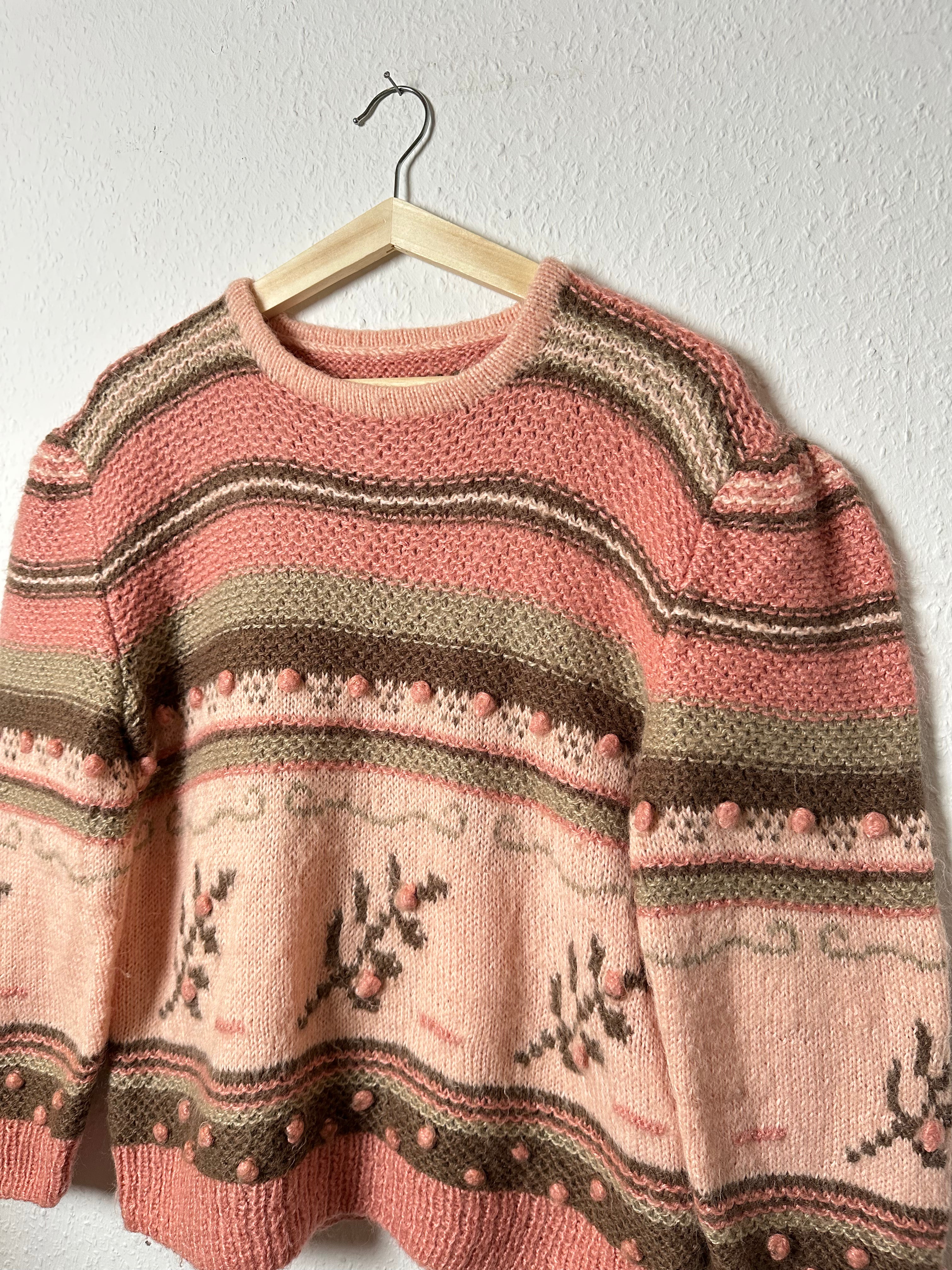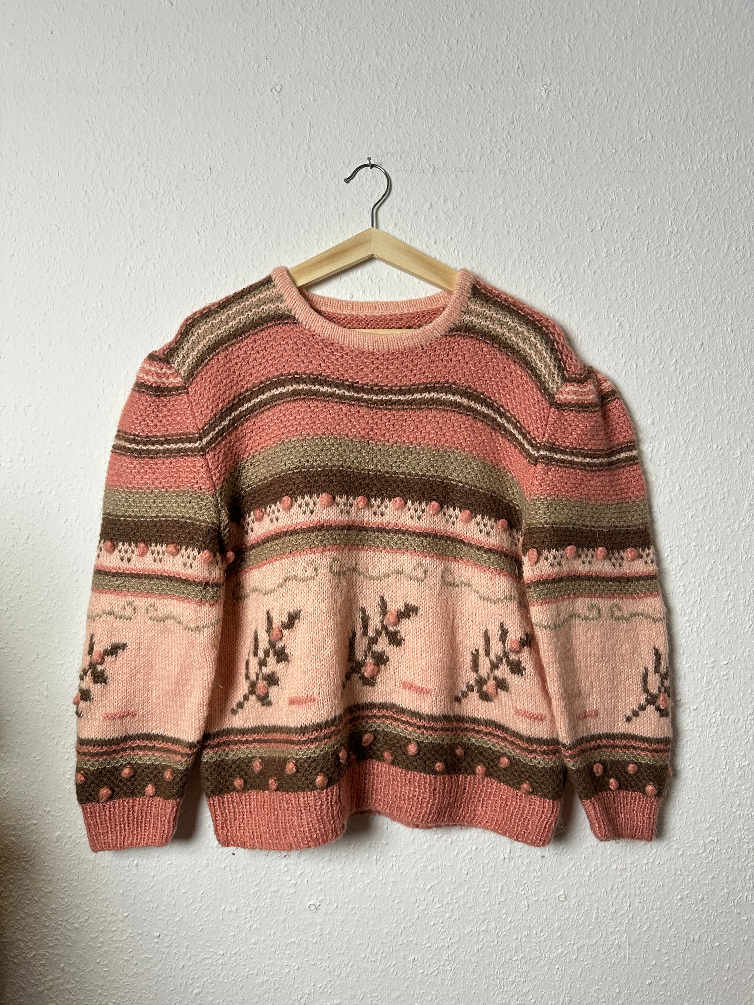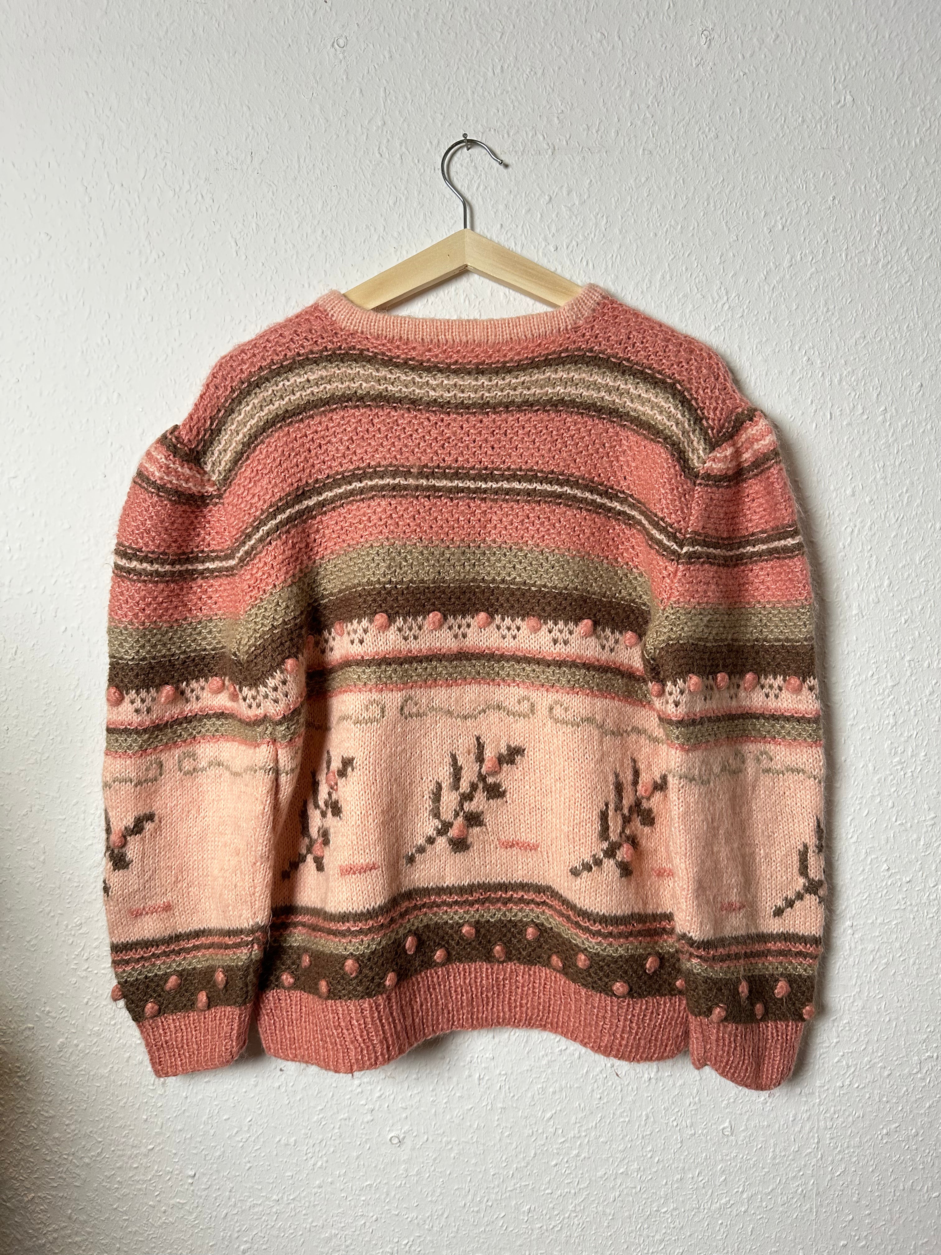Ein wunderschöner Vintage Strickpullover in Rosé mit wundervoll süßem Strickmuster. Handmade gefertigt - und so ein wunderschönes Farbmuster.