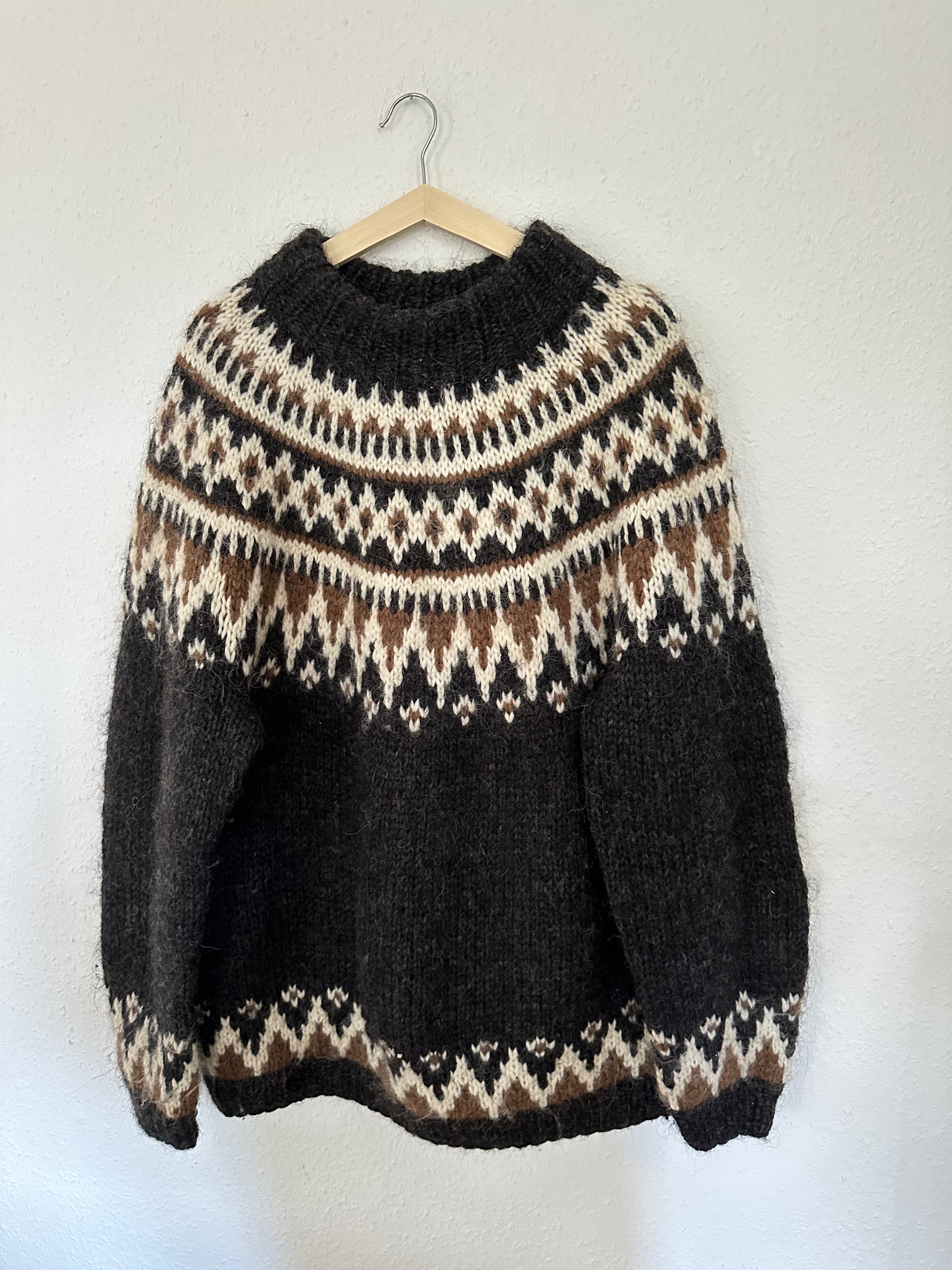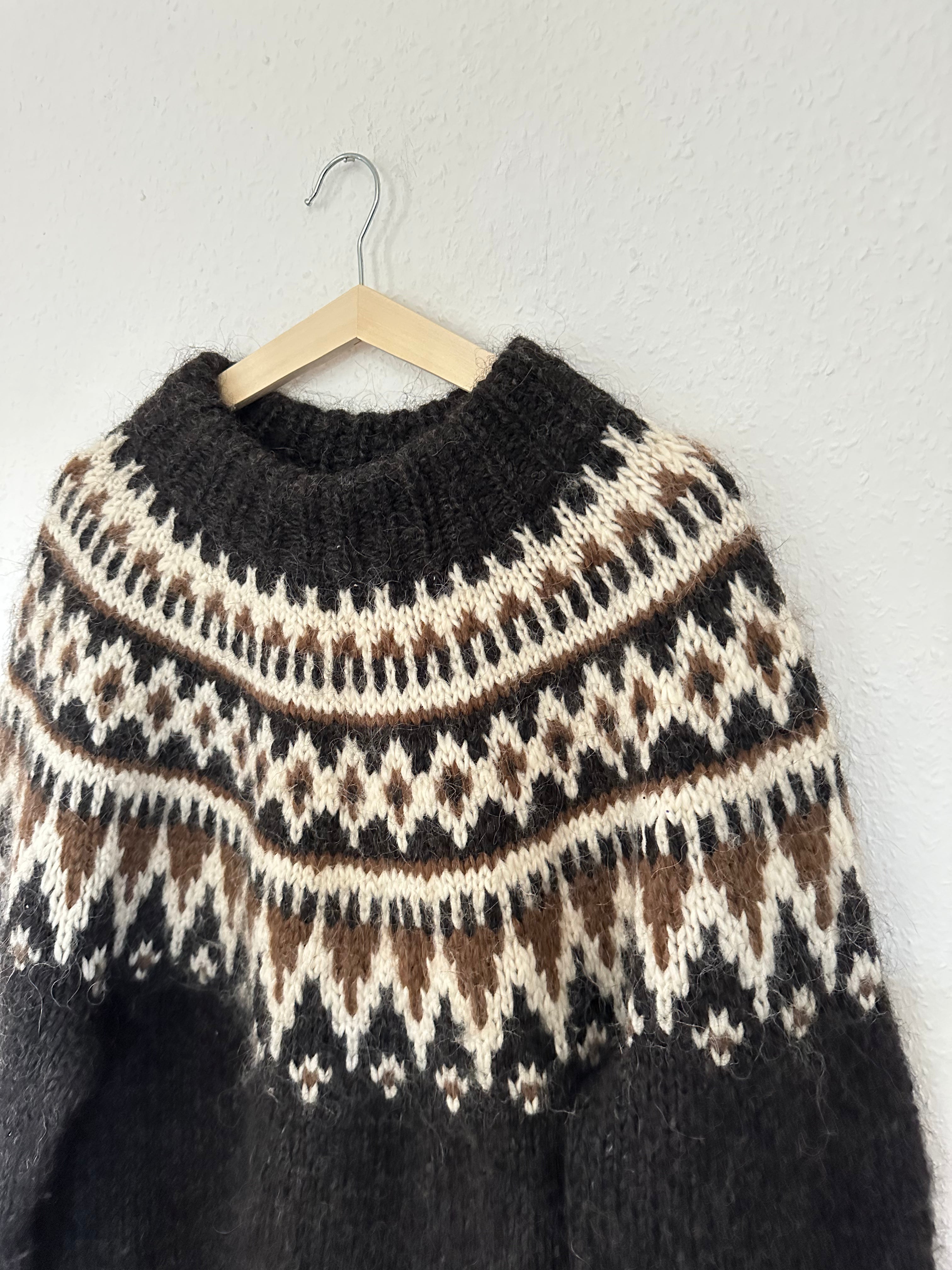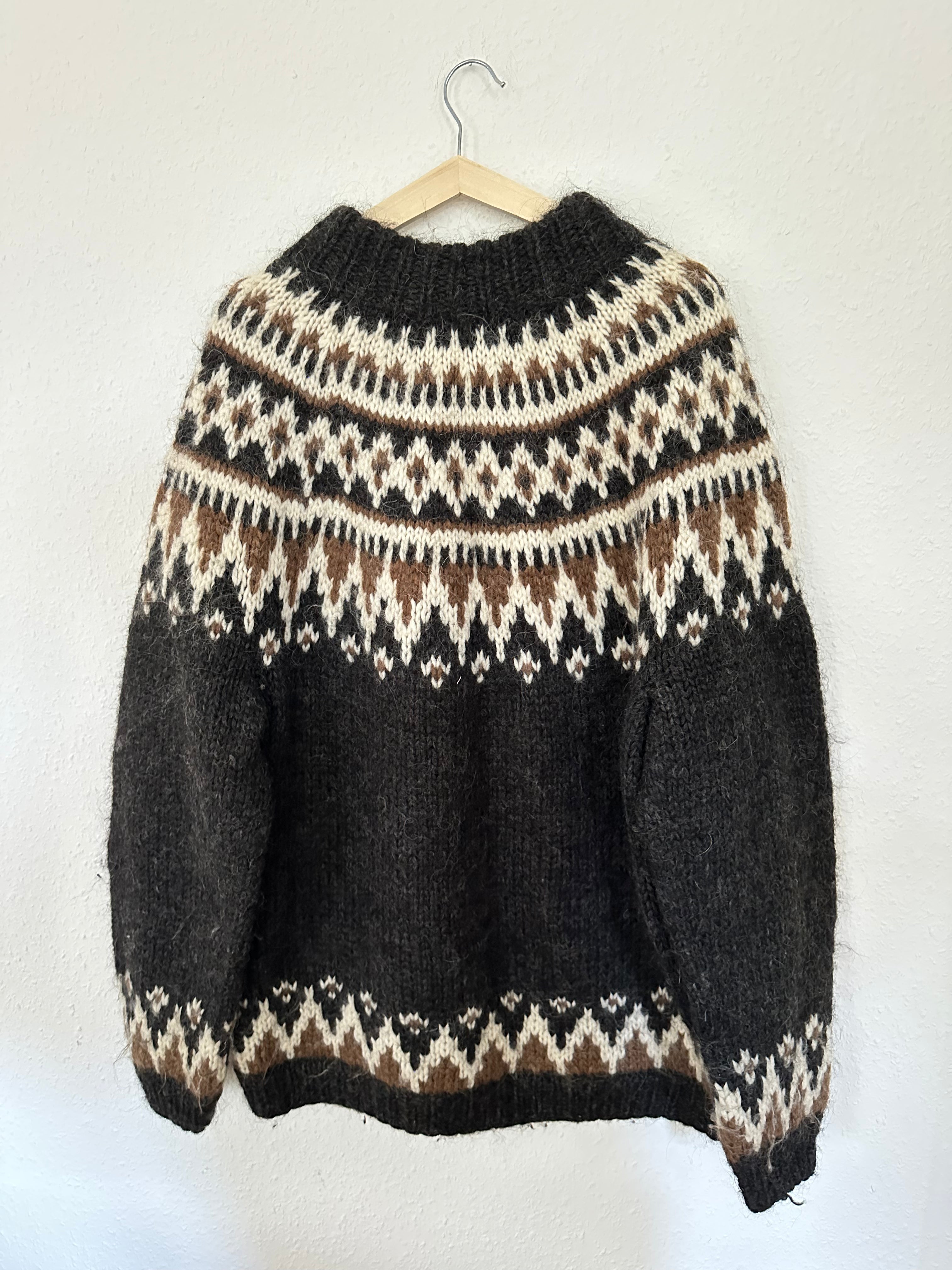 Ein wunderschöner skandinavischer, Handmade gefertigter Vintage Strickpullover. Wir lieben die Boho-Farbtöne und das süße Strickmuster.
