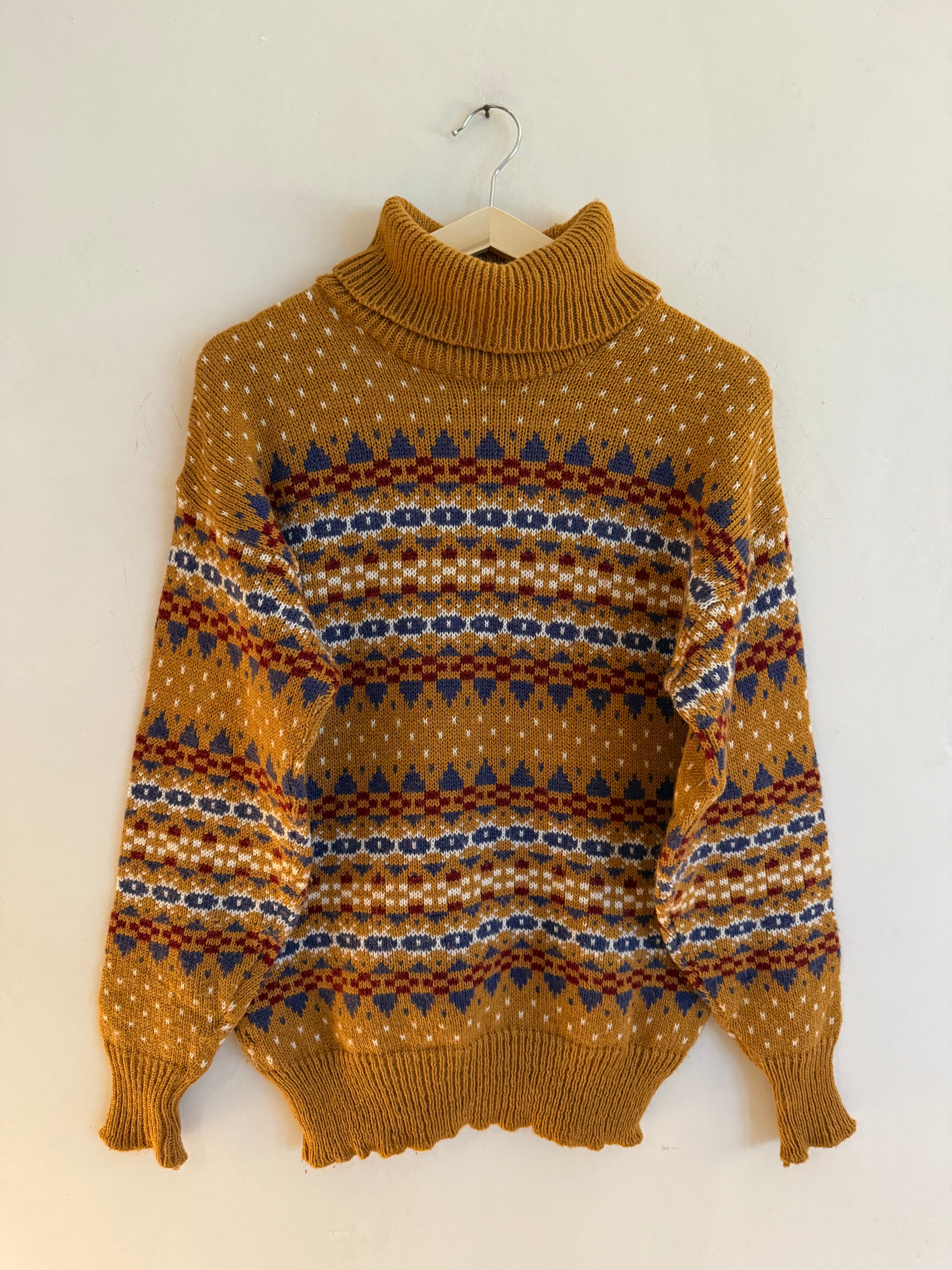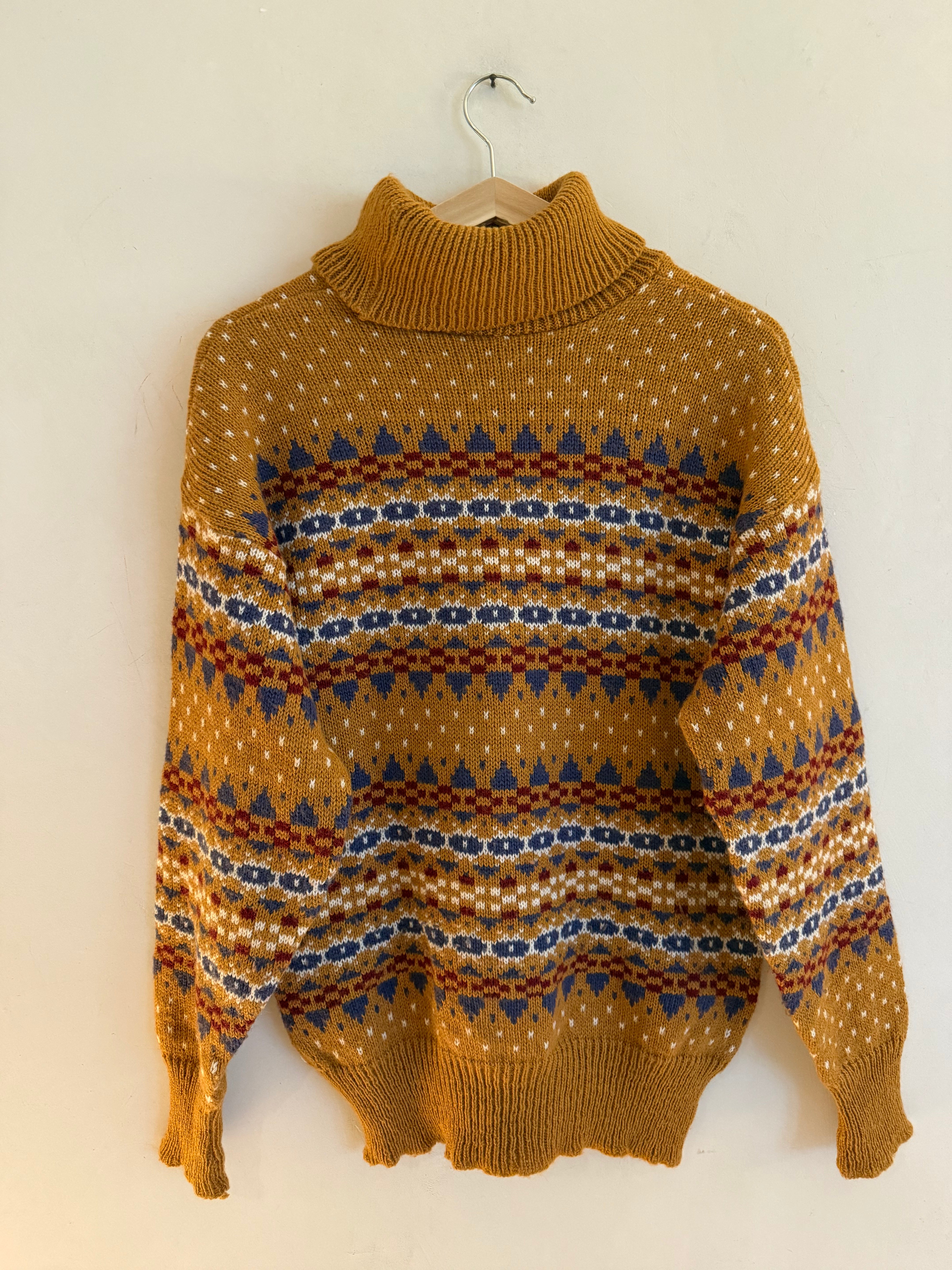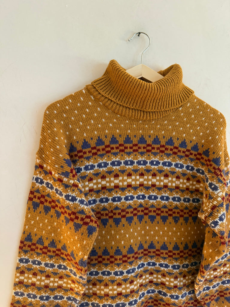 Ein wunderschöner Color Academia Knit in Mustard-Gelb mit buntem Strickmuster. Schöner kann ein Knit nicht sein.
