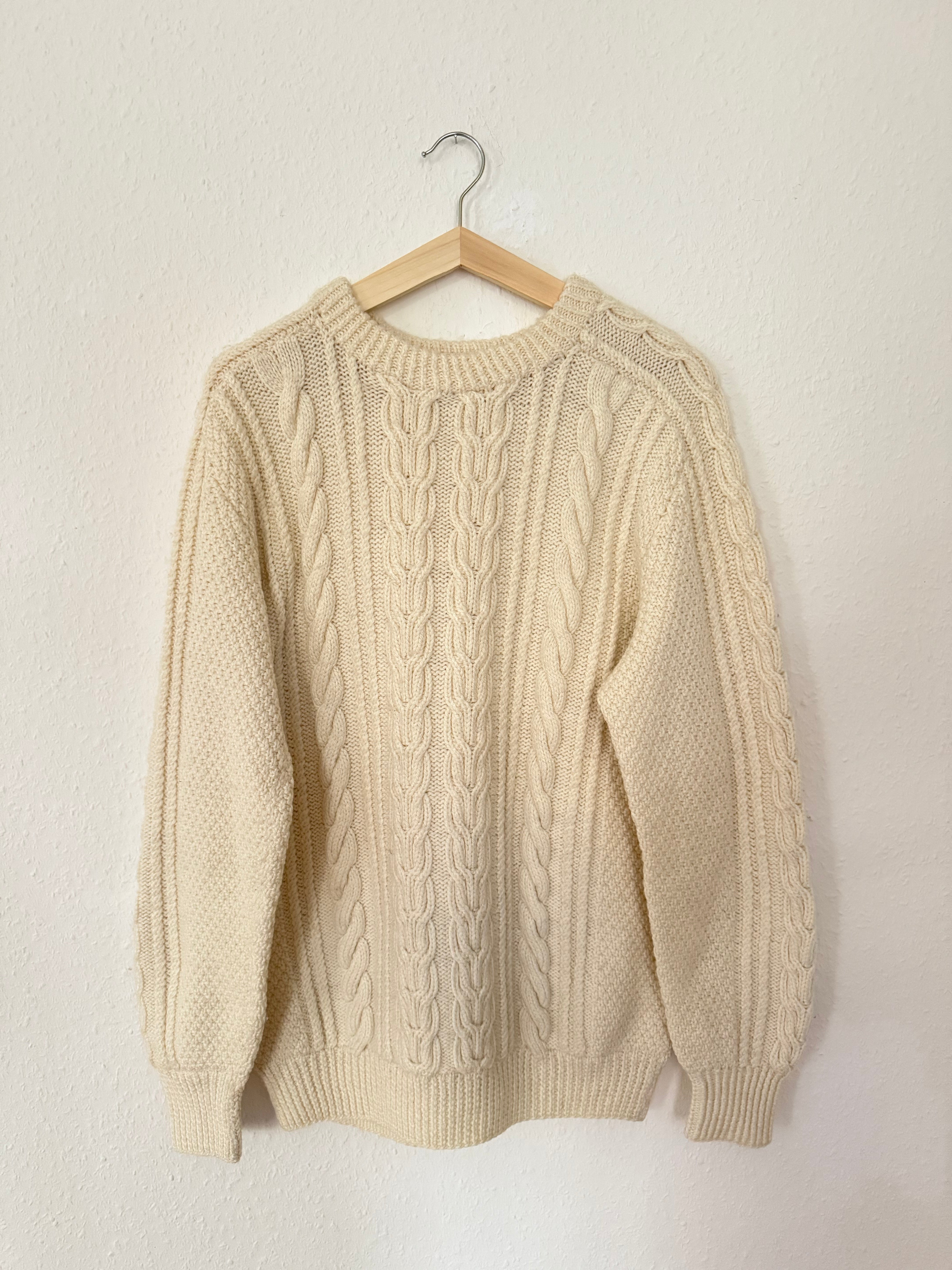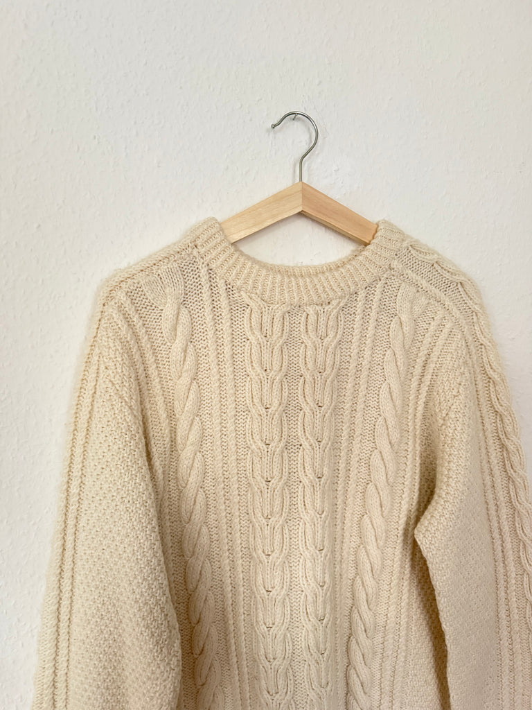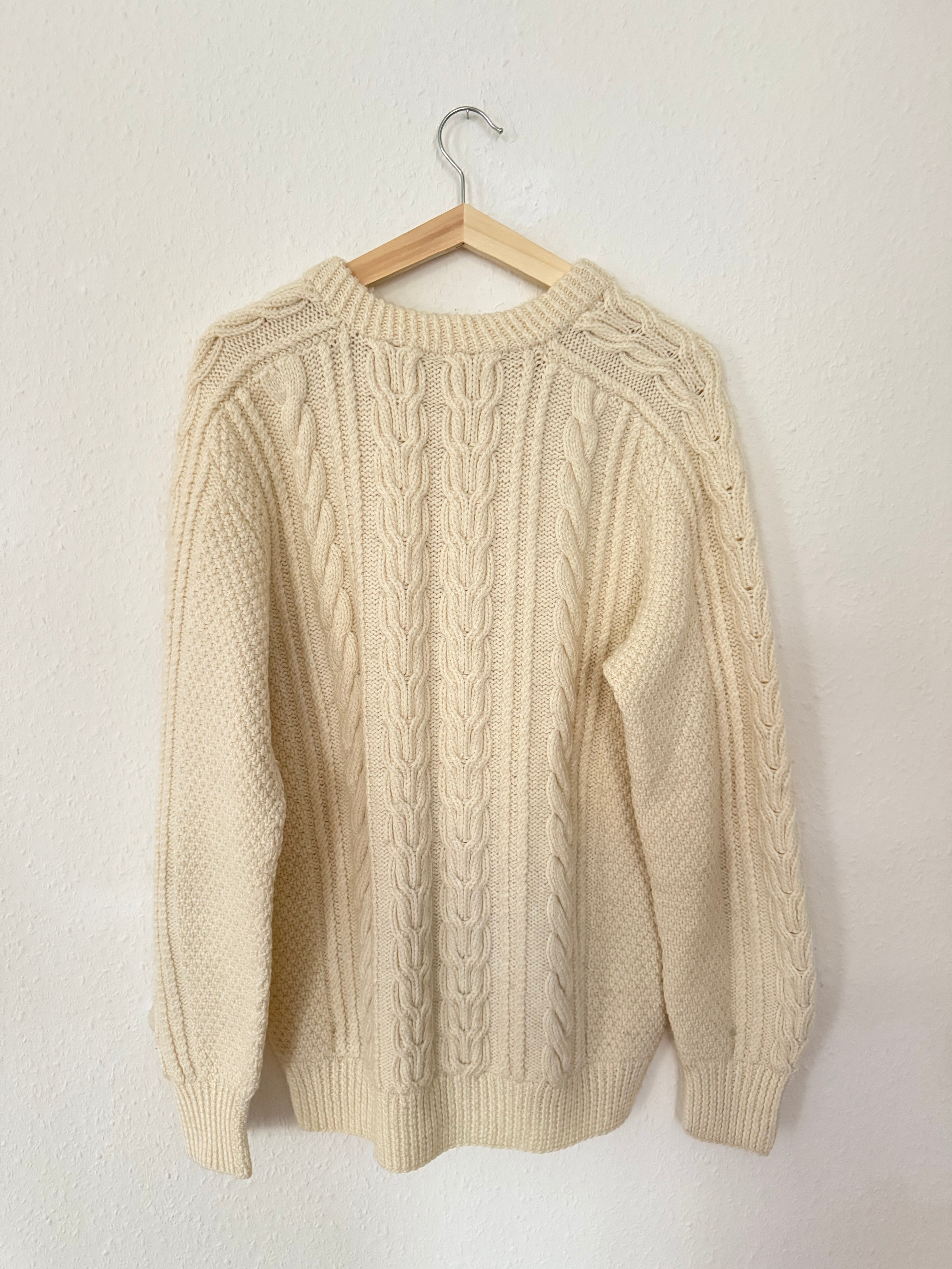 Wie schön will man sein? Ein wunderschöner Vintage Zopfmuster Strickpullover in Weiß. Handgefertigt aus 100% Wolle. Wir lieben den tollen Vintage Fit und besonders die Farbe.